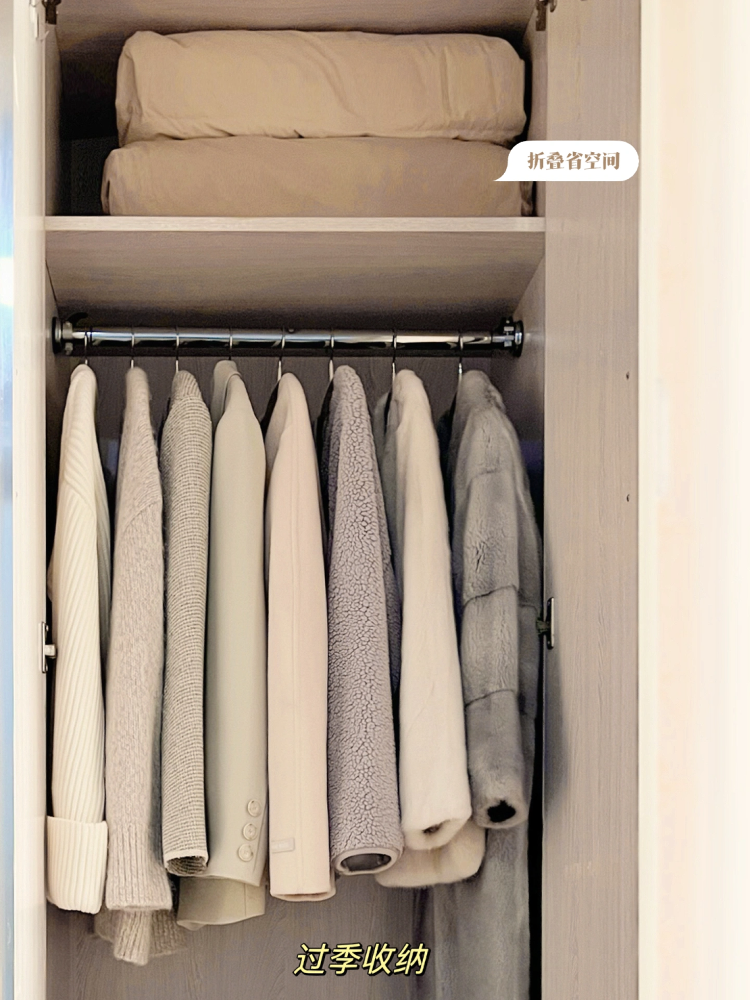 好喇,羽绒服的洗护指南告诉大家喇,(ps:姐妹们平常还是尽量减少机洗喔,洗的越多羽绒保暖性越差)再附赠大家一个收纳小技巧:日常不穿了可以反着挂,省空间还能保持干净。过季不穿了我通常是叠起来收纳到衣柜上方~