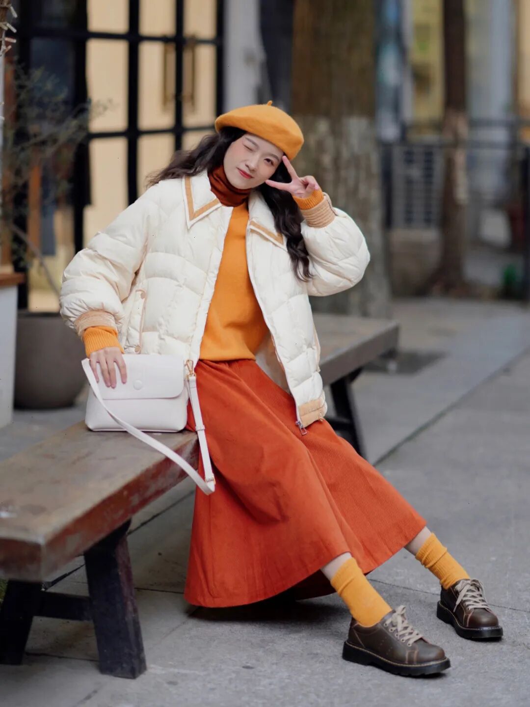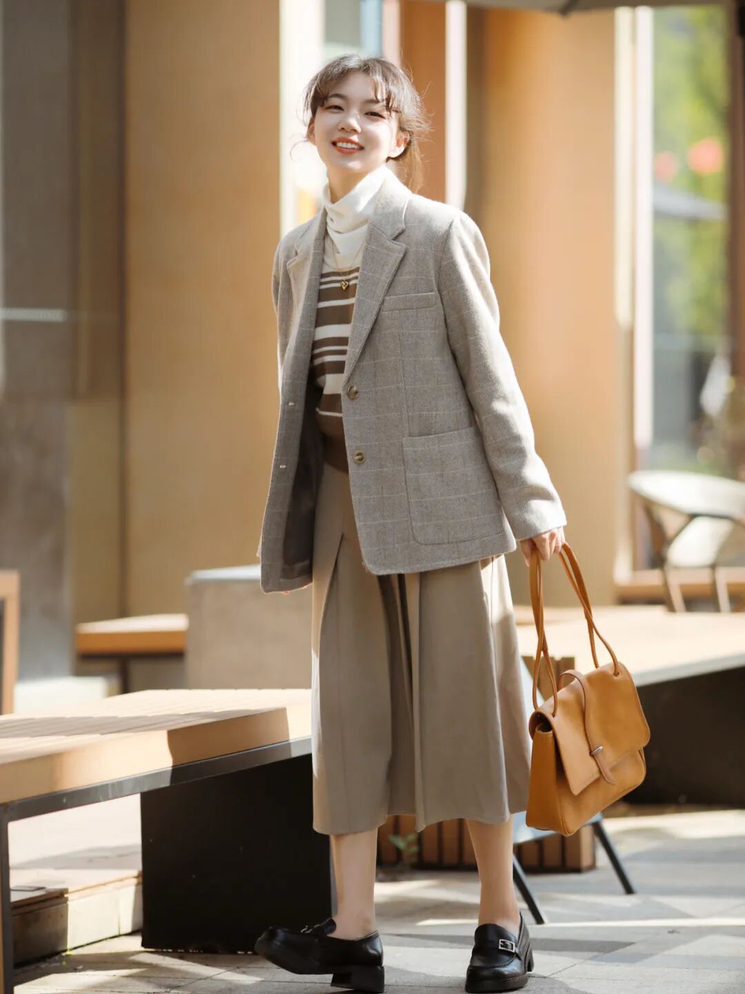 小个子的姐妹想要在秋冬穿得保暖,当然也是可以选择长裙滴,不过除了注意单品“轻重”,还要记得内外长度错开。