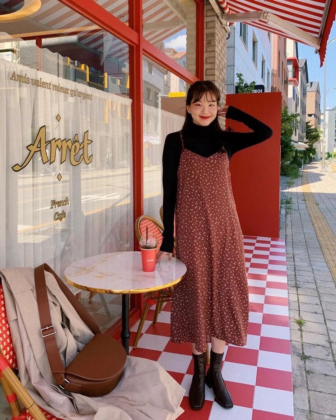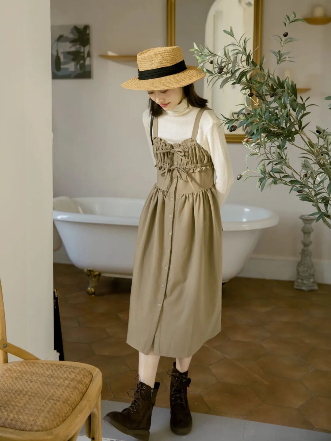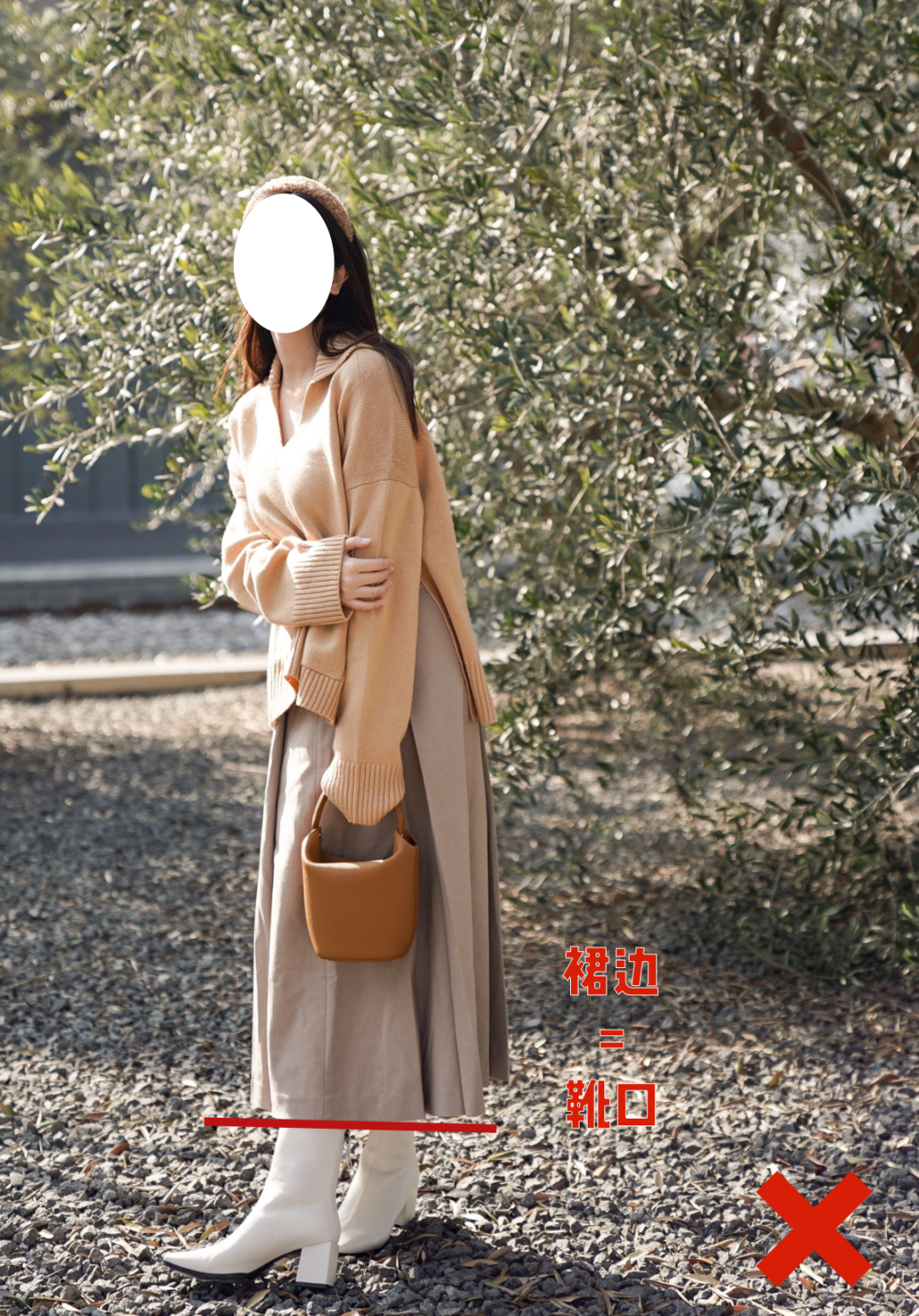 因为整套穿搭它在哪里结束,就容易在那儿形成视觉中心,如果靴口和裙边刚好“撞上了”,衔接处就会变得扎眼、膨胀。