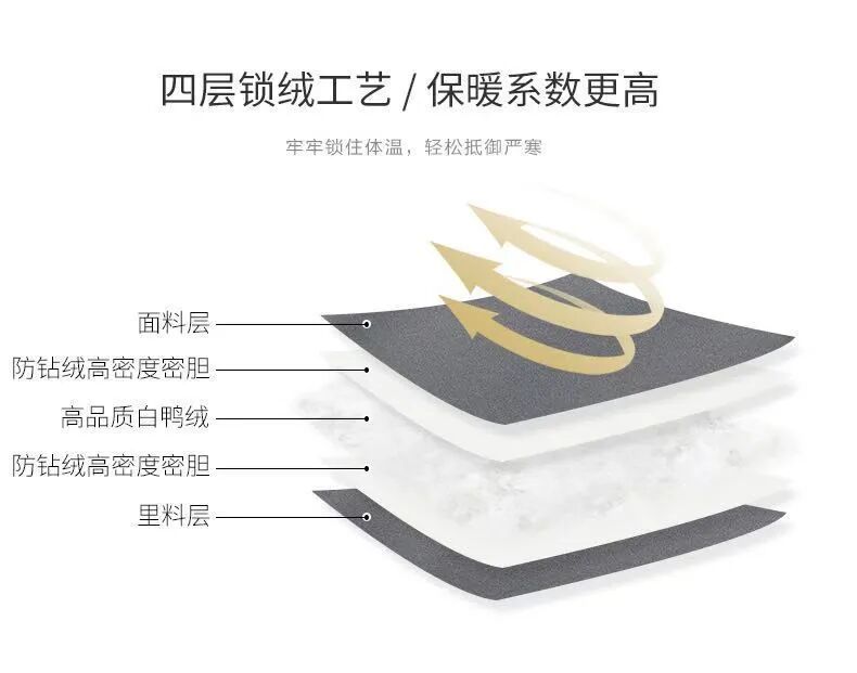 外层高密度防水面料、内层增加防绒胆布固定住白鸭绒、里层采用亲肤里布,一共 4 层各层阻挡,针脚细密。
