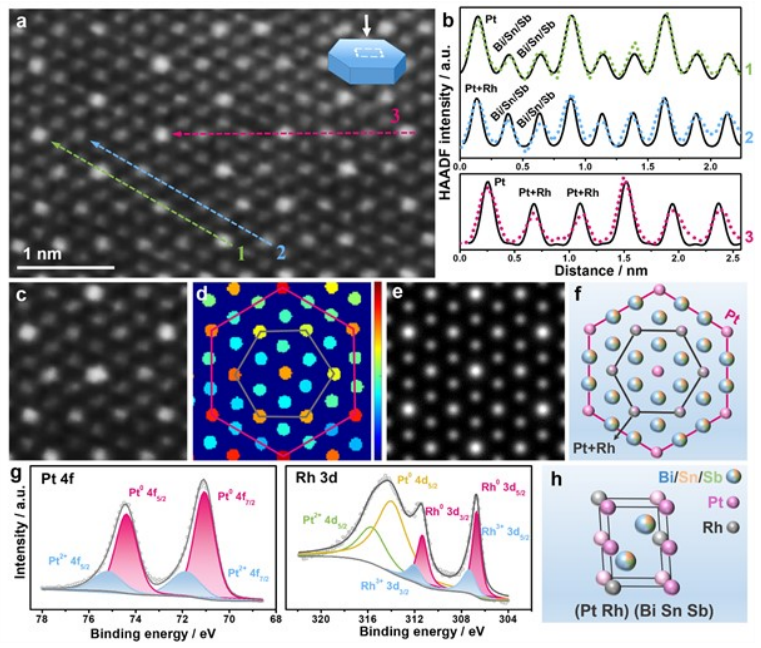 图2 (a)PtRhBiSnSb HEI纳米板的中心区域的HAADF-STEM图像;(b)线强度分布;(c,d) HAADF图像与相应的原子彩点分布;(e,f)图像模拟与相应的原子模型;(g)Pt 4f、Rh 3d的XPS谱图;(h)单晶胞结构模型。@Wiley