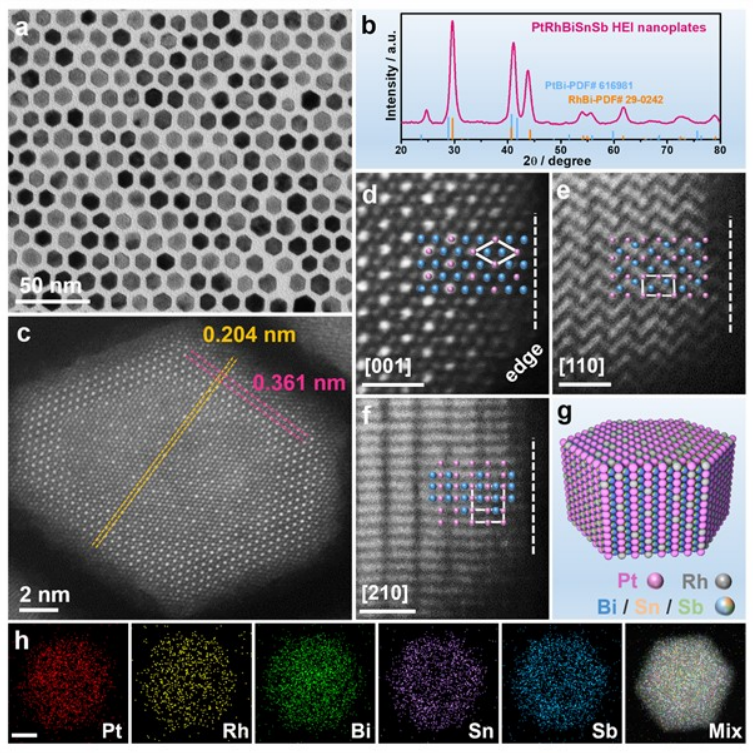 图1 PtRhBiSnSb HEI纳米板的(a)TEM图像;(b)XRD谱图;(c)HAADF-STEM图像;(d-f)沿不同轴观察晶格原子排列;(g)结构示意图;(h)EDX映射图像。@Wiley