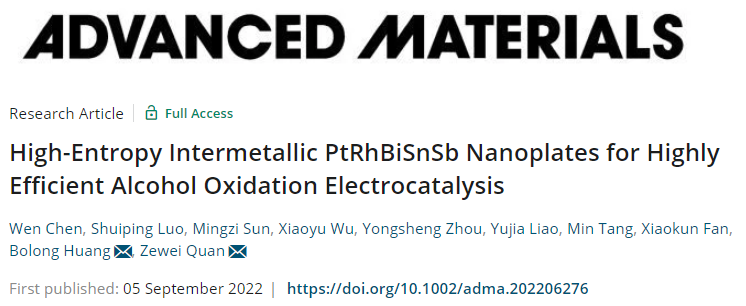 Chen W., Luo S., Sun M., et al. High-Entropy Intermetallic PtRhBiSnSb Nanoplates for Highly Efficient Alcohol Oxidation Electrocatalysis, Advanced Materials, 2022.