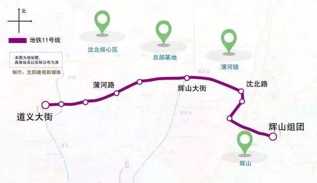 11号线:西起道义大街,东至辉山组团,走行蒲河路、辉山大街、沈北路。串联沈北核心区、总部基地、奥特莱斯、中国医科大学、蒲河岛、蒲河镇、辉山组团等片区。