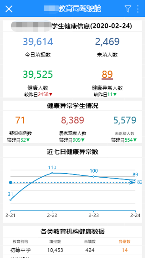 在大数据应用推进返校复课工作中,Smartbi结合云平台技术免费为某市教育局搭建了一套数据化健康管理系统,协助教育局对辖区内各学校和教育机构收集人员健康数据,让教育管理者在疫情时期在线数据分析成为可能,实现数据化管理与运营,为科学复课、精准施策提供数据基础。