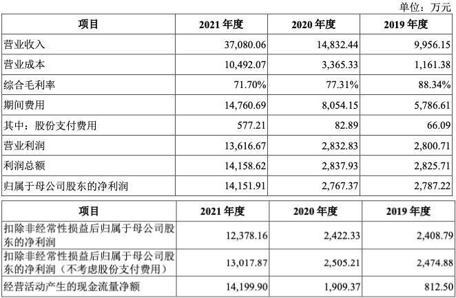 还有一组数据值得关注,在2019-2021年期间,以萨技术归属于母公司股东的净利润分别为2787.22万元、2767.37万元和14151.91万元;扣除非经常性损益后的归属于母公司股东的净利润分别为2408.79万元、2422.33万元和12378.16万元,2019-2021年年均复合增长率为126.69%;公司经营活动产生的现金流量净额分别为812.50万元、1909.37万元和14199.90万元,由此可见,伊萨科技整体经营正保持着良好的发展态势。
