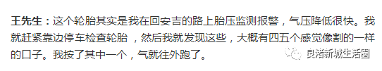 王先生:我去换轮胎的时候,找到一个修车的。他修了三十多年的车了,他说你这个轮胎不是说气压低碾的这种,你这个是人为割的。