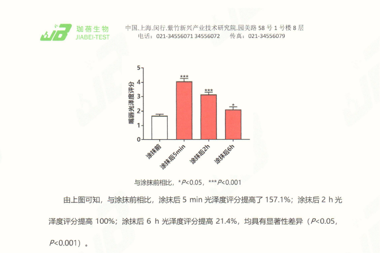 *涂抹后5min光泽评分提高157.1%,涂抹后2h提高100%,涂抹后6h提高21.4%