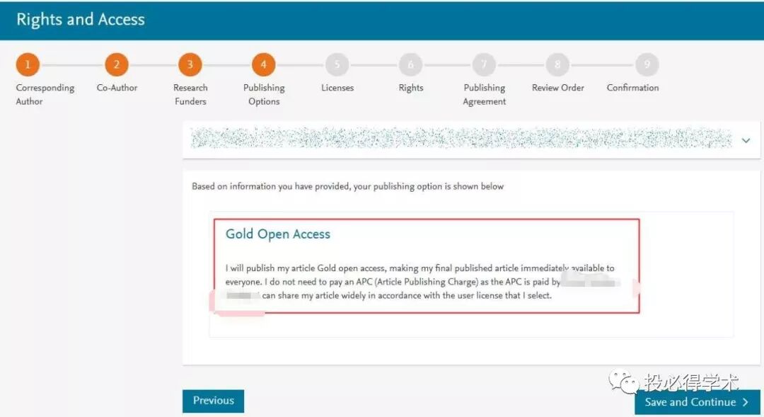 接下来,系统根据我们提供的信息,给出出版选项Gold Open Access。保存继续。。。