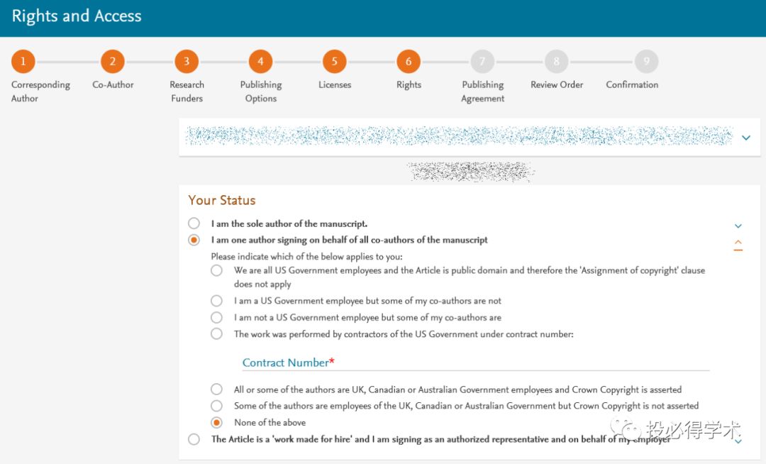 这里需要选择你(通讯作者)的身份:唯一作者、一个作者或者委托人。这三个选项字面意思都很好理解,我就不解释了。我是其中一个作者,下面还有很多其他子选项,我直接选择最后一项——以上都不是。这应该不用解释了,大家应该都看得懂!出版确认 Publishing Agreement这里会给出很多版权等条款,可以直接略过,最后选择同意即可!