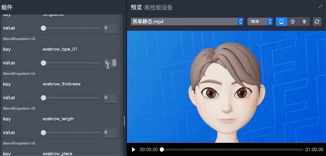 捏脸功能是通过Blendshape来实现的,比如脸颊宽度,可雕刻出最宽形态设置值为“1”,最窄形态设置为“-1”,输入-1到1之间的数值即可实现自定义的捏脸效果。通过雕刻生成Blendshape的实现方式也有一定的局限,在眉形的设计上,给每个眉形一个Blendshape,选择该眉形时调用其Blendshape的数值“1”,但对眉毛厚度长度的变形是公用的一个Blendshape,这样在不同眉形去调整时会出现不规整的效果,目前我们只能控制眉形数量来满足基础的调整。3.5 引擎调试