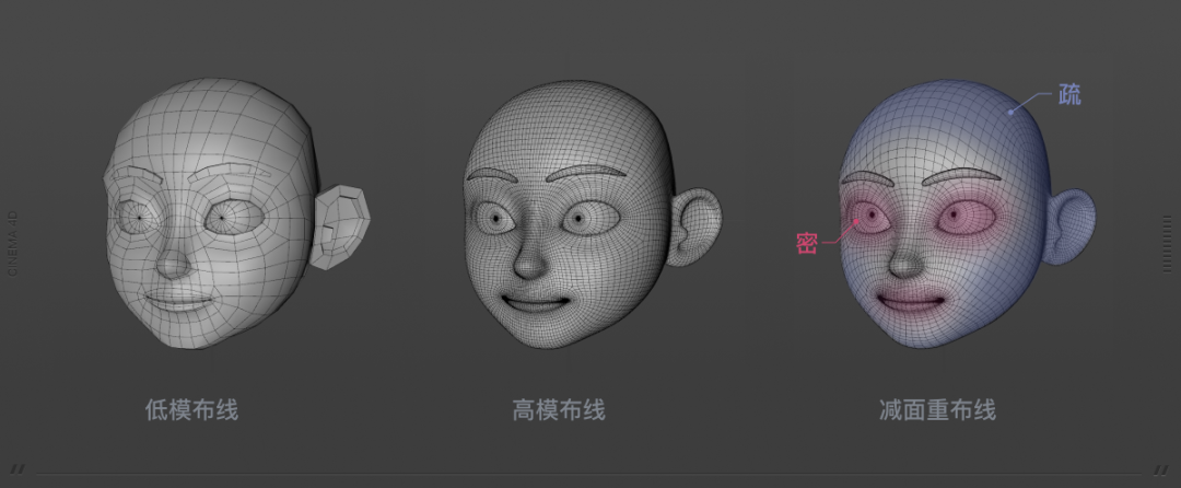 3D人像只作为图像设计是比较简单的,只要电脑不冒烟,对多边形面数没有要求,过惯了百万面数的奢华日子,面对虚拟人项目里引擎要求面数在两万以内顿时傻眼,为了最终在互动时保证性能流畅,模型减面工作必不可少。在C4D中我们通常借用重拓扑插件来减少面数,但生成的效果不尽人意,布线并不贴合人脸肌肉走向,眼睛嘴巴变形严重。后来了解到S26版本的C4D更新了一项重拓扑工具,可选择样条用于保持原本布线走向,解决了重拓扑布线不贴合肌肉走向的问题。但由于面数要求苛刻,眼部嘴部的线条按重拓扑的方法会过于粗糙,后来又在拓扑出的模型上修补调整。