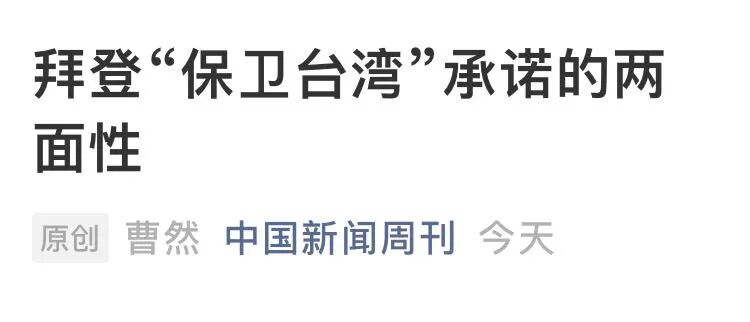 据中国新闻周刊报道:2021年10月21日,拜登在美国某节目中回答民众提问时,宣称美方有承诺,要在中国台湾地区遭受武力攻击时施加保护。