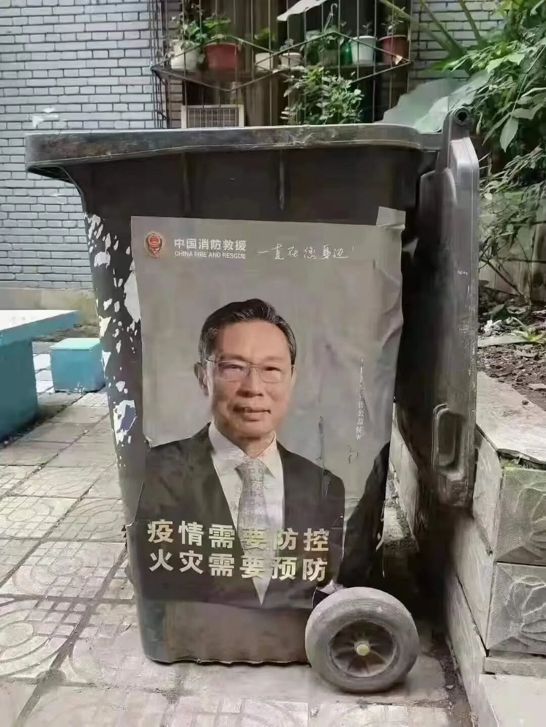 让人觉得稀奇的,是钟南山的画像被贴在垃圾桶上。