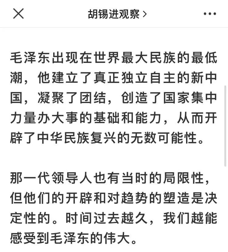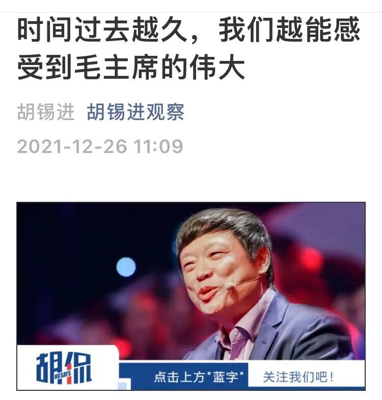 文章最后一句:“时间过去越久,我们越能感受到毛泽东的伟大。”这个时间,应该是社会主义中国的时间,当然也可能是世界性的潮流时间,但还是可以理解为共产党领导的中国时间。现在胡锡进为什么要说:“时间过去越久,我们越能感受毛泽东的伟大.....”呢?这实在是意味深长,又不可描述。
