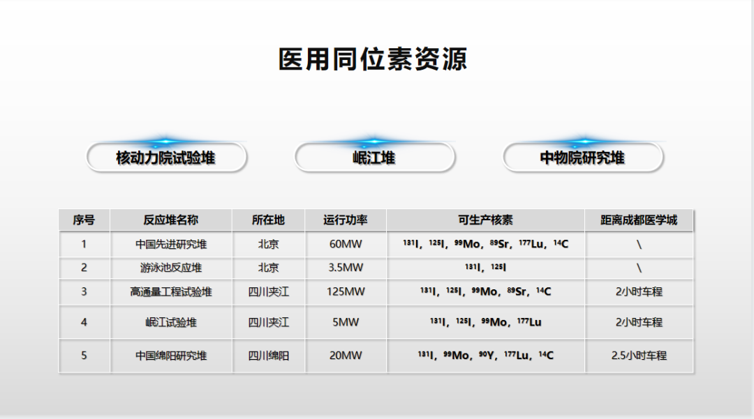 目前距成都市仅2.5小时车程拥有3座在役反应堆,分别是夹江的高通量工程试验堆和岷江试验堆及绵阳的中物院研究堆,能够提供镥—177、钇—90等14种医用核素。成都医学城先后与中国核动力研究设计院、绵阳九院就医用同位素供给等产业协力发展进行对接,保障园区放射性药企快速就近取得核素原料,降低供应链成本。