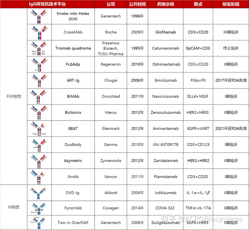 为了解决带有Fc片段的双特异性抗体构建过程中的轻重链错配的问题,已有多种技术平台被设计出,包括Fresenius Biotech的TrioMab、Roche的Crossmab、Genentech的KIH、Abbvie的DVD-Ig、Genmab的DuoBody、OncoMed的BiMAb等。不带有Fc的“双特异性抗体”技术平台包括BiTE、DART、TandAb、ImmTAC、TriKE等。