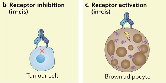 肿瘤等疾病的发生、发展往往涉及多条信号通路,单一信号通路被阻断往往不能完全抑制疾病的进程,反而还容易导致其他补偿通路的激活。双特异性抗体可以特异性阻断多条信号通路,达到更好的抑制疾病的效应(如图8)。