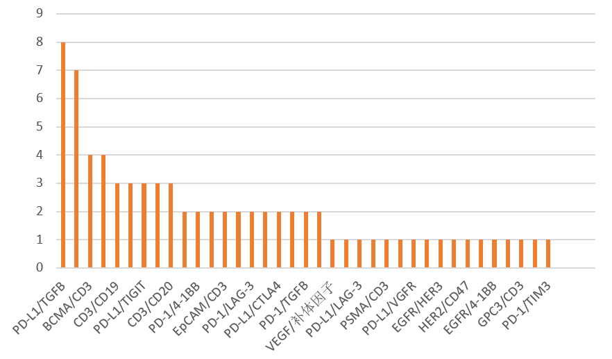 目前国内生物技术公司在研的双抗中有46款产品的靶点之一都是PD-1(16个)/PD-L1(32个),其次是双抗另一个经典靶点—CD3(21个)(图表25)。在研最多的靶点组合是PD-L1/TGFB双抗,目前有8款产品在研,其次是BCMA/CD3,有7款产品在研(图表26)。