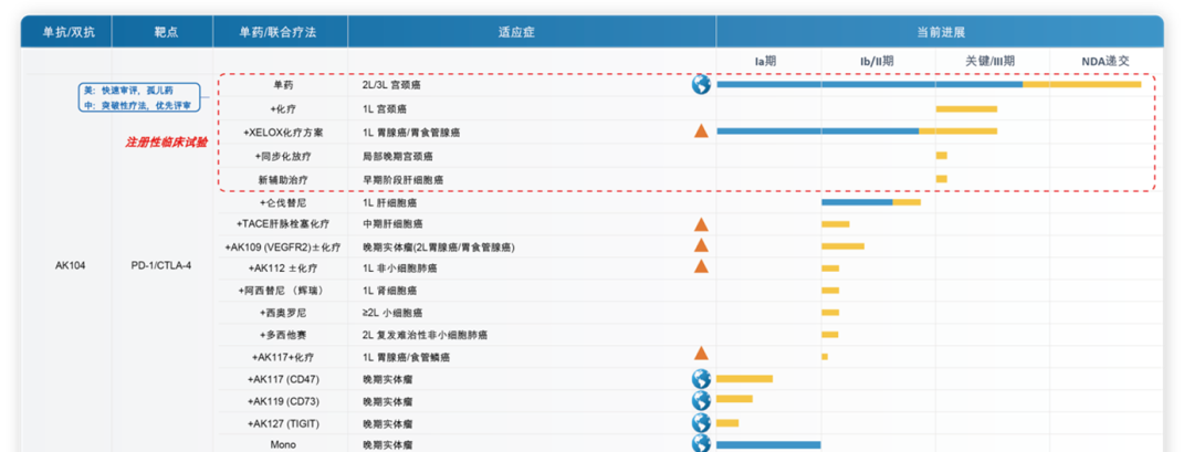 AK104在2022年6月29日获得NMPA的批准上市,用于治疗既往接受含铂化疗治疗失败的复发或转移性宫颈癌患者。AK104是首个获批上市的国产双抗,也是全球首款PD-1/CTLA-4双抗,成为自有研发的双抗企业中进展最快的。