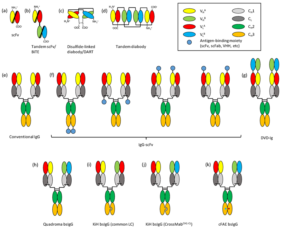 图表4:双抗的不同类型结构示意图((a) scFv, (b) BiTE, (c) DART, (d) Tandem Ab, (e) IgG, (f) IgG-scFv, (g) DVD-Ig, (h) Quadromma BsAb, (i) KiH BsAb, (j) KiH-CrossMab CH1-CL,以及 (k) cFAE BsIgG)