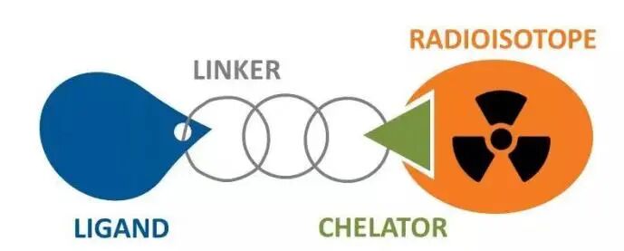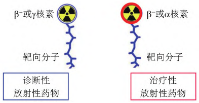 放射性药物种类丰富,一般是由用于诊断或治疗的放射性核素、载体分子及两者之间的连接物3 部分构成,见图3。各种研究表明,用于靶向治疗的理想放射性核素必须具有以下基本特征: