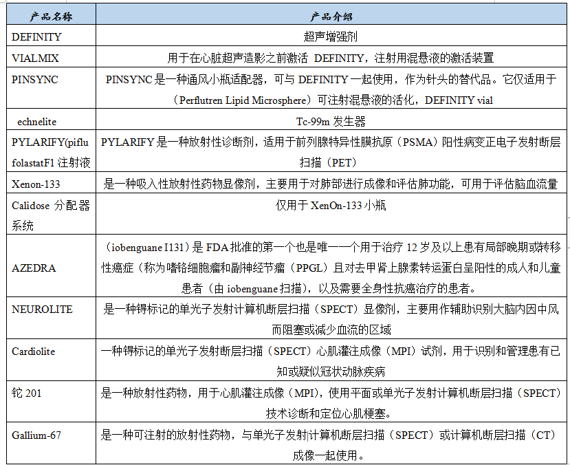 JubilantDraximage Inc是印度JubilantLifeSciences旗下的全资子公司,公司总部位于加拿大蒙特利尔,在当地拥有1家工厂,主要从事核医学的放射性药物开发、制造和商业化应用,客户包括医疗机构和核药房。公司主要产品包括拥有甲状腺疾病治疗/诊断的I-131胶囊、用于骨显像的99mTC-MDP肺灌注显像的99mTC-MAA、肾、脑和肺功能显像的99mTC-DTPA,用于PET心肌梗死患者诊断的氯化铷(Rb-82)也已经获得FDA批准。