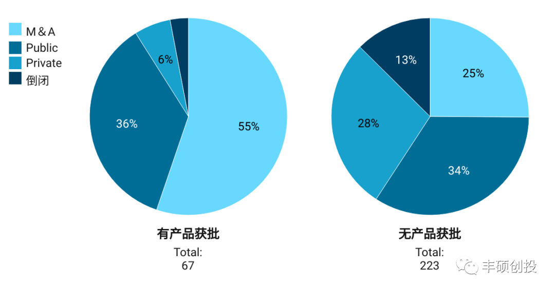 在这290家biotech里,有168家披露了累计融资额(一级市场+IPO融资)和收购/当下市值,以这168家biotech为样本,分析他们的投资回报情况,横坐标为收购或当下市值,除以累计融资额,简称倍数,纵坐标为分布频率,根据有无产品获批划分为两类,根据public还是M&A状态再细分下去。