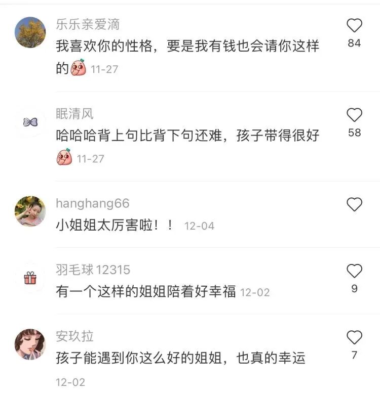 在视频下面的一条条评论中,困在各自琐碎生活里的人们赞美她的清醒和洒脱。很多人说自己也想要一个这样的保姆,也有年轻人表示很羡慕她的工作,而尼莫说:“可能他们把我夸得太好了。”