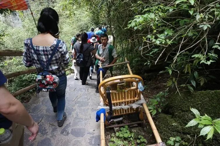重庆某景点,一位旅游博主,选择当地的滑竿(坐轿子)上山。