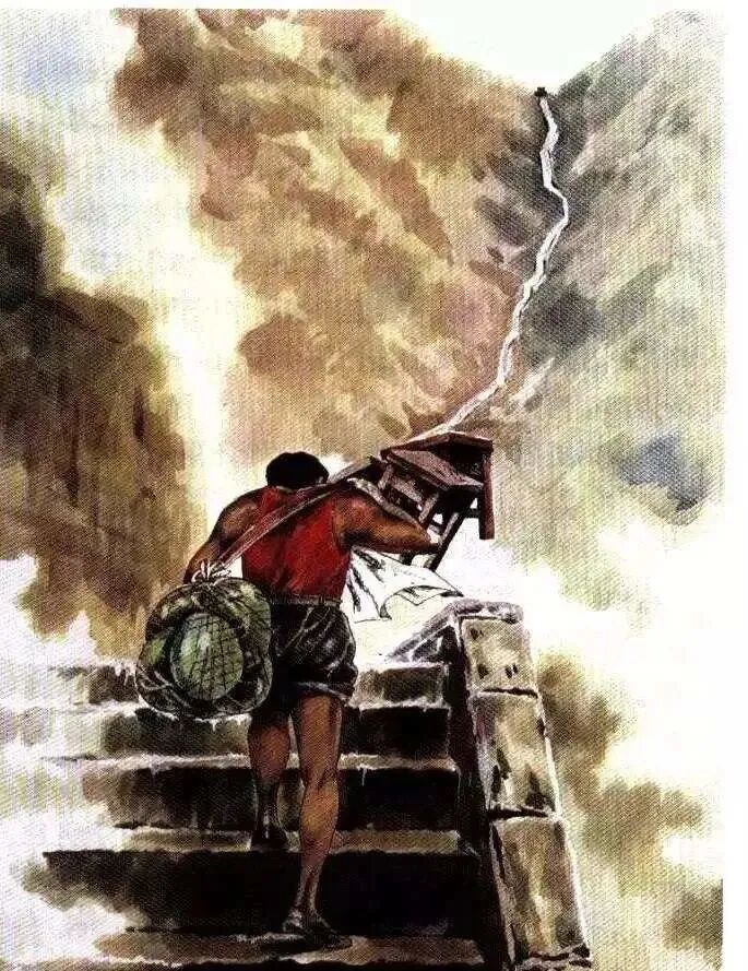 “我画了一幅画——在陡直的似乎没有尽头的山道上,一个穿红背心的挑山工给肩头的重物压弯了腰,他一步一步地向上登攀。