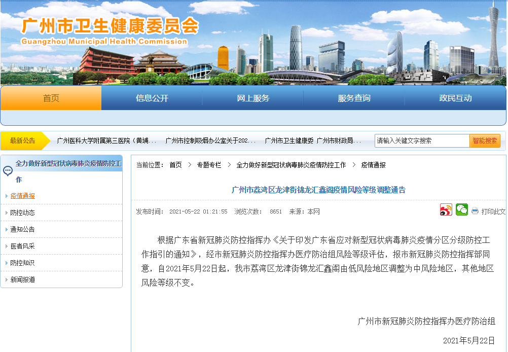 随后,广州市召开市委常委会会议暨市新冠肺炎疫情防控领导小组(指挥部)会议,传达学习省委常委会会议精神,研究部署荔湾区疫情防控方案。截至21日15时,广州已采集重点区域重点人群核酸样本2.65万份(已出结果均为阴性),对8个场所实施封闭式管理。截至21日17时,初步甄别的密切接触者,均已集中隔离采样(已出结果均为阴性),对8个重点场所进行环境采样(其中有2份是在患者家居环境样本中检测出阳性,其余均为阴性)。同一天,广州市商务局专门就住宿餐饮行业防疫工作发布通知》,要求从业人员做好疫苗接种,并强调接待家庭私人聚会聚餐一般控制在 10 人以下。5月22日凌晨,广州市卫生健康委员会网站发布通告:龙津街锦龙汇鑫阁上调为中风险地区。![]()