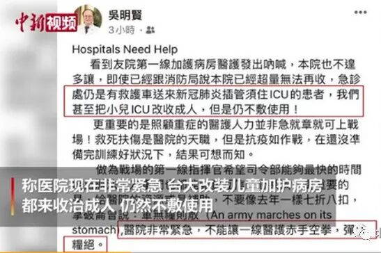 早在5月底,台大医院院长吴明贤就已发出求救信息:“收治超过100名新冠病患,危重症20多人,已经满载。目前,医院的儿童ICU已全部供成人使用。”