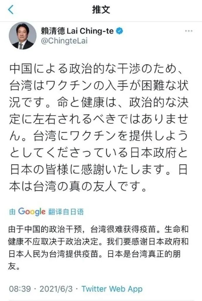 死前的最后一条推文还在给台当局“唱赞歌”,