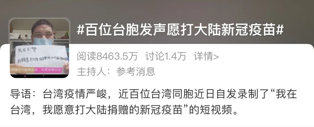 近日,百位台湾同胞自发录制了“我在台湾,我愿意打大陆捐赠的新冠疫苗”的短视频,每位视频拍摄者都表示:此生最大的愿望就是能够打上大陆的新冠疫苗。