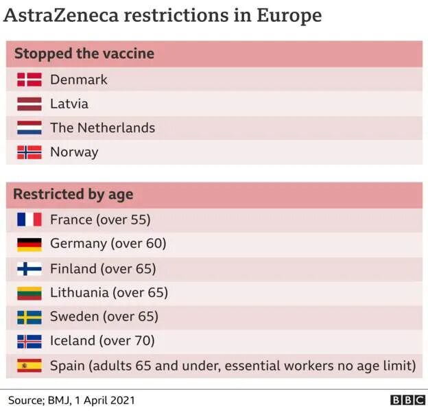 英国屡次强调自己的牛津疫苗“利大于弊”后,还是很自觉地放出了一张欧洲各国对其进行限制的表;