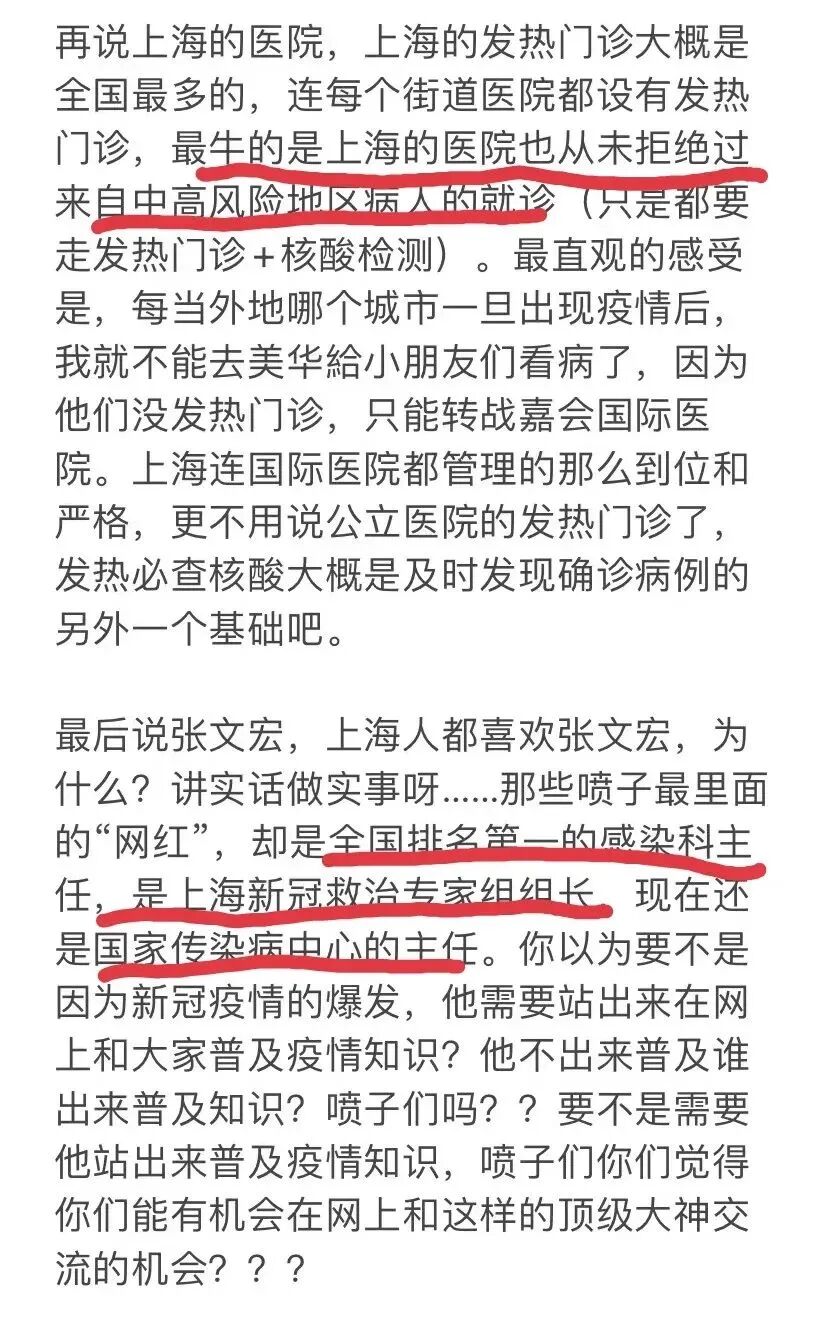 “最近作为西医买办利益集团代言人的张文宏医生,居然发表高论,声称要与病毒和谐共处。看了这段话,简直气得要吐血,怀疑他是不是神经错乱了。难道我们中国人花几千亿打疫苗,全民参与,各级政府强力执行防控措施,就是为了与病毒和谐共处?既然要与病毒和谐共处,那我们还花那么多钱,费那么大的劲,去战什么疫,防什么疫?”