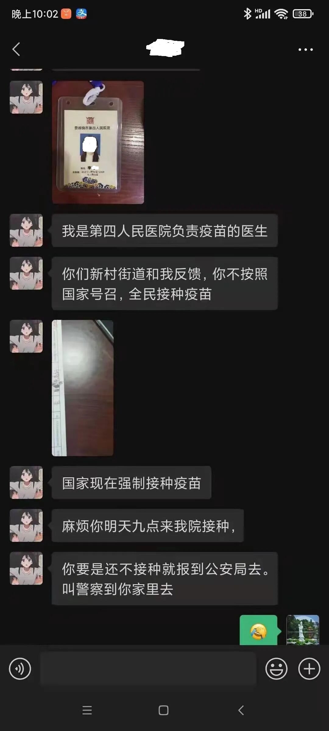 不仅如此,更有甚者直接联系和威胁未接种者,“不接种就报到公安局,让警察到你家里去”,甚至交谈中还出现了“国家强制接种疫苗”的字眼。