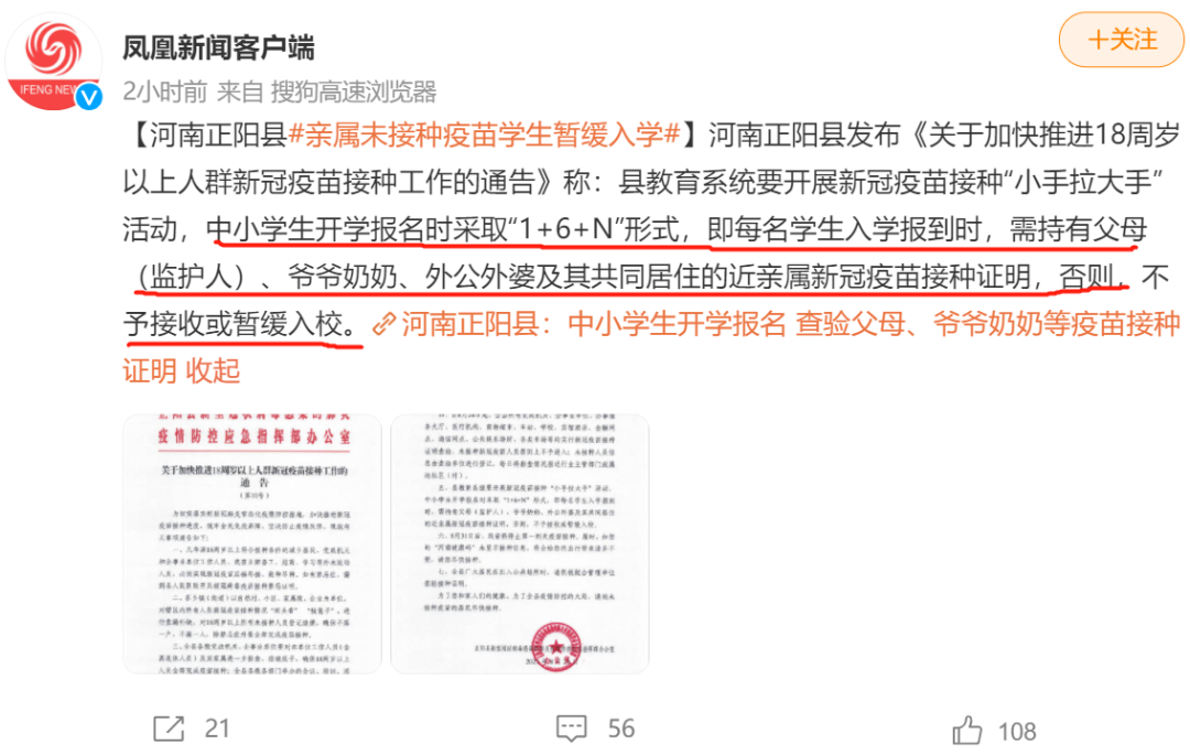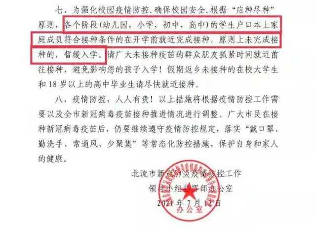即每名学生入学报到时,需持有父母(监护人)、爷爷奶奶、外公外婆及其共同居住的近亲属新冠疫苗接种证明,否则,不予接收或暂缓入校。