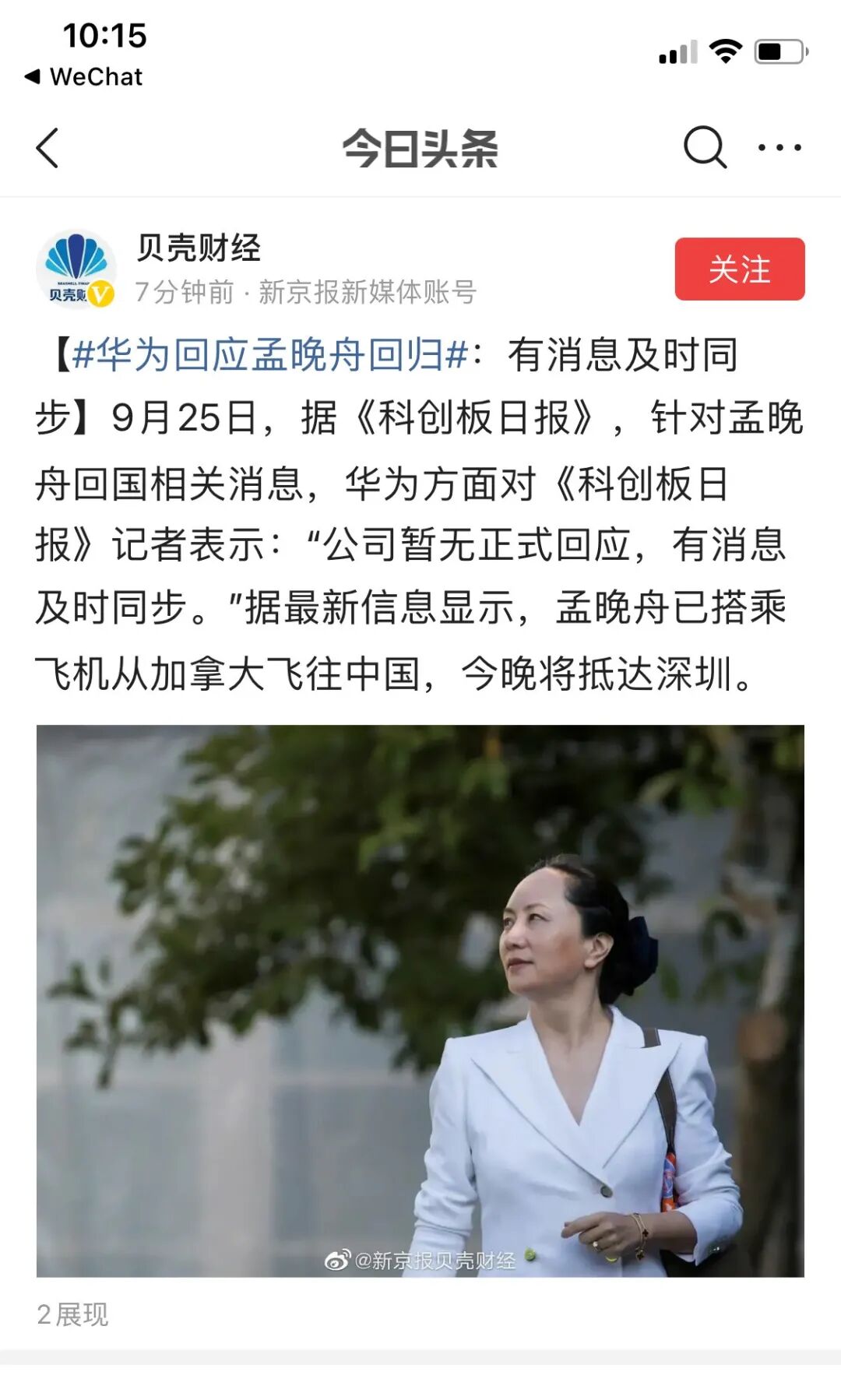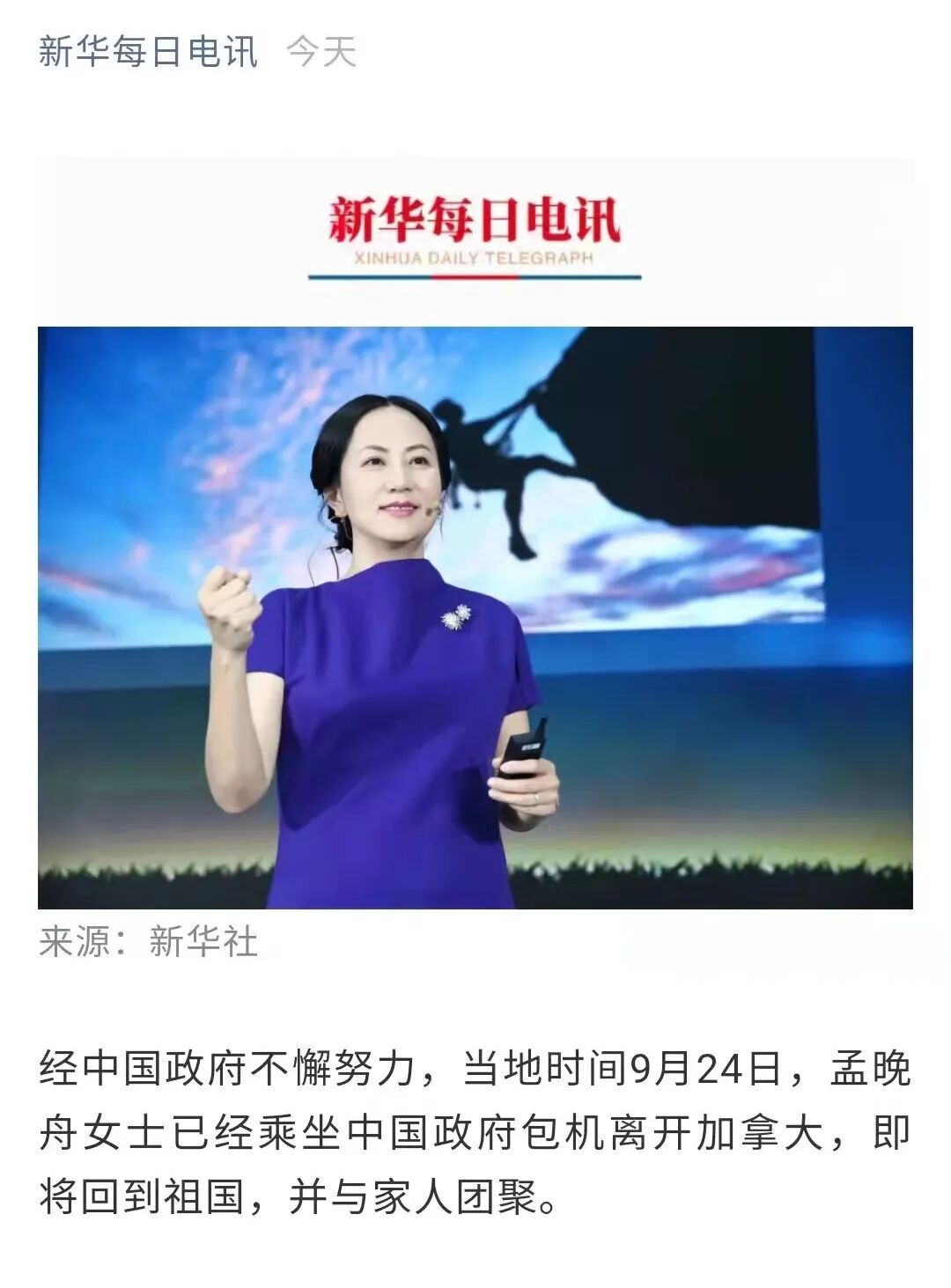 新华社消息:“经中国政府不懈努力,当地时间9月24日,孟晚舟女士已经乘坐中国政府包机离开加拿大,即将回到祖国,并与家人团聚。”