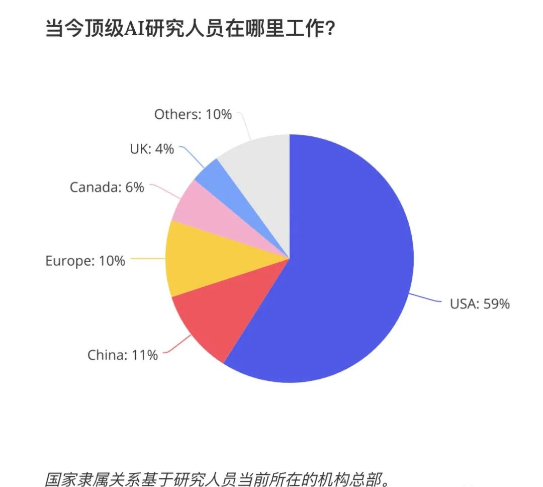 首先,当前结果是美国的AI机构和公司拿下了全球60%的顶级研究人员。
