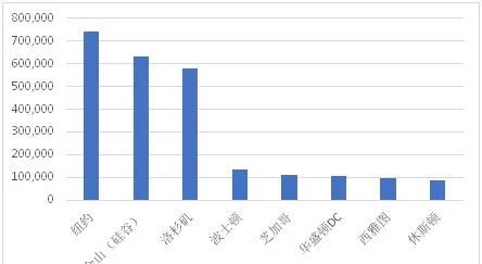 下图则是华人居住人数排名前8大地区;在纽约,旧金山和洛杉矶地区,都有50~70万华人居住在那里。
