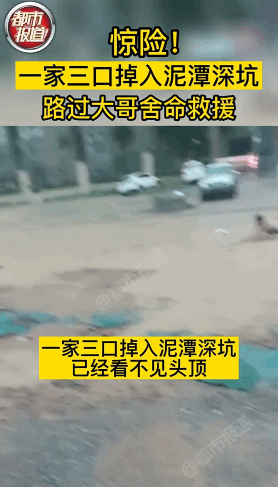 一家三口全部掉入水坑之中,已经看不到头顶,路过的大哥舍命相救。