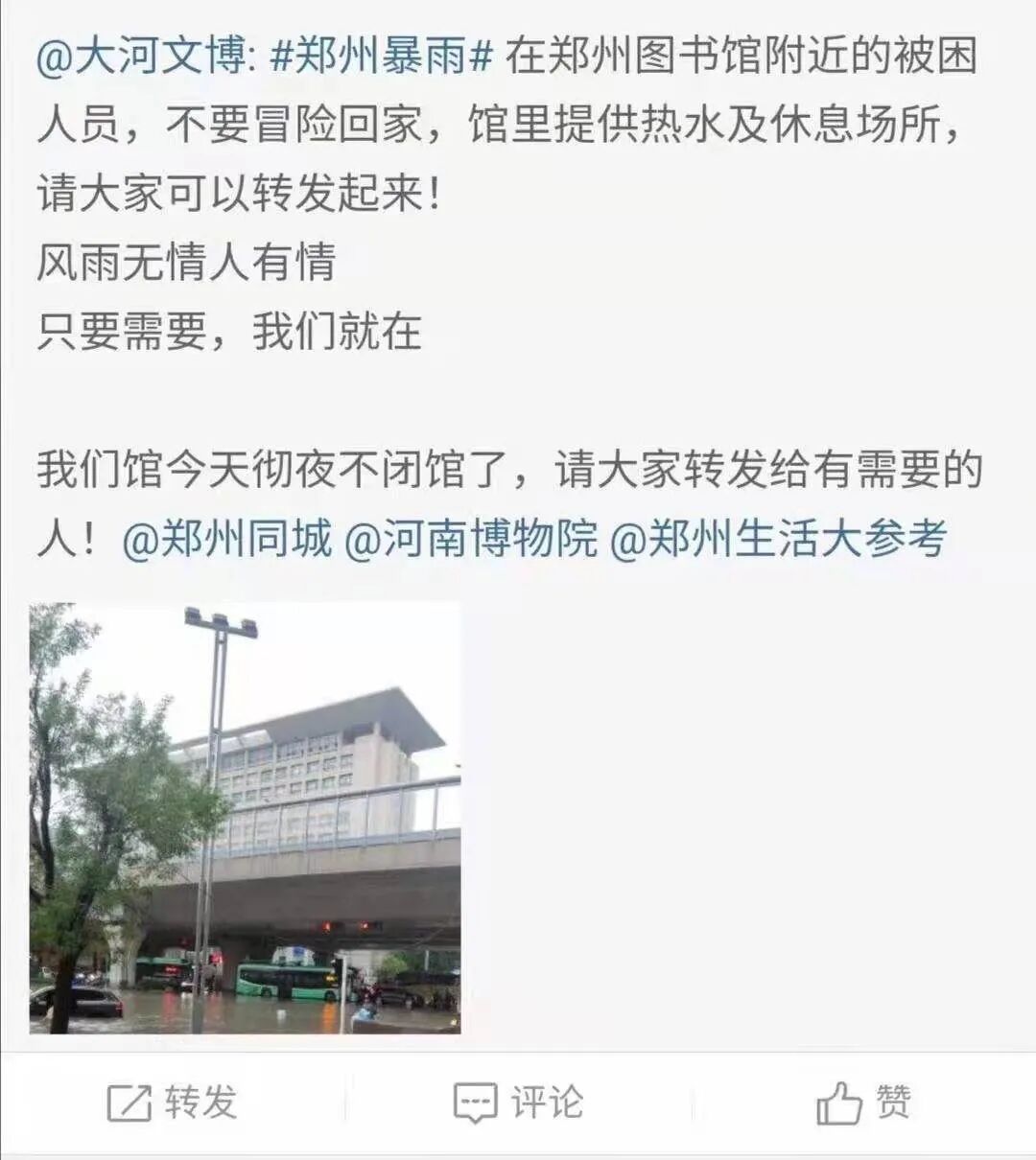 当天,郑州图书馆发文:这一夜,我们彻夜不闭馆。图书馆提供免费的热水和休息场所,请大家不要冒险回家。