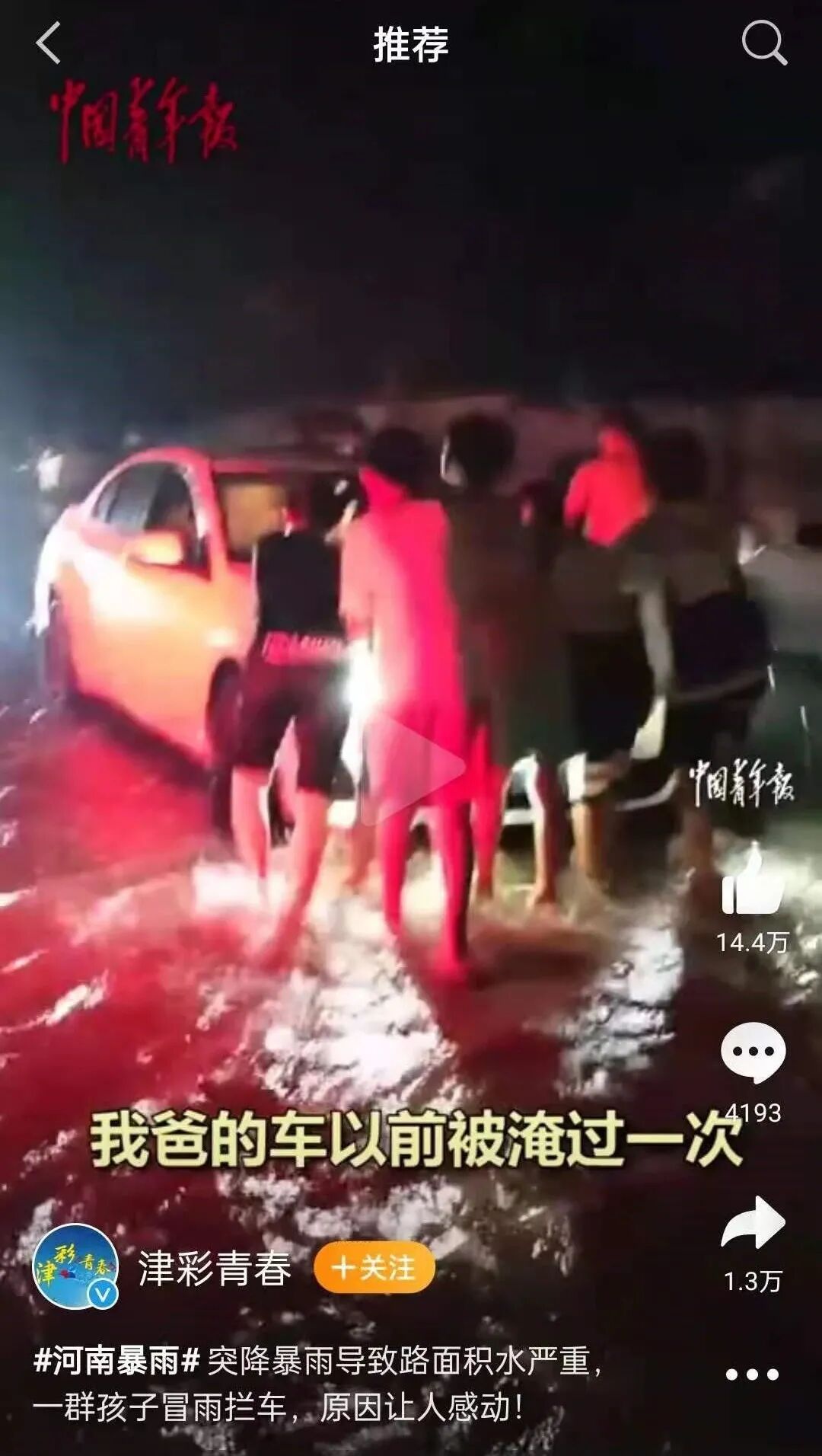 一群孩子冒着雨,自发走上街头,阻挡前来的车辆,提醒着前面的水太深,建议司机绕道。