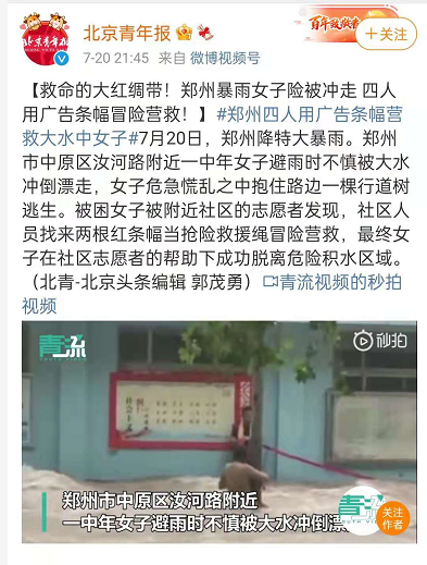 社区的四个工作人员用广告横幅开展生死营救,终于帮女子成功脱离危险水域。