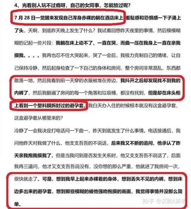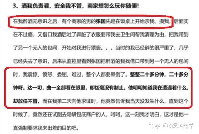 女方自述,她模糊地记得有个叫张国的商家,在她醉酒后开始对她进行了各种各样方式的猥亵。直到后来她查看监控才知道自己被张国带入一无人的包间,并对她进行了猥亵。其顶头上司高管曲一就在包间里,眼睁睁地看着自己的下属被对方侵犯。
