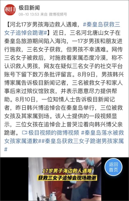 17岁的少年韩兴博和其他几个刚下班的小伙伴结伴出去游玩的时候,突然一阵“救命”声传来,他们迅速向声音处跑去,发现海中有3个女孩遇险。3个女孩出于求生的本能,一直拼命地往上跳,可是反而越陷越深。海水暗流汹涌,阻力极大,韩兴博原本就没受过什么专业训练,光是救人就用尽了全部力气。最终3个女孩成功上岸,他自己却永远消失在了这片黑色的海域里。他是家里的小儿子,父母老来得子才生下了他,得知他因救人而牺牲之后,母亲赶到秦皇岛,在海边哭得撕心裂肺,悲痛不已。明明他才过完17岁的生日,可是却一下子阴阳两隔,她说什么都接受不了。17岁,大好的年华,他原本应该有更美好的未来,更滚烫的人生。而得知这个年仅17岁的小英雄因救人离世的消息后,许多市民纷纷前来献花,寄托哀思。我们为这个年轻的生命惋惜,为这场意外而难过,也打从心底为这个悲伤的母亲而悲痛。首先,是网传三个女孩被救后,对韩兴博家人冷漠以对,称不认识救人的男孩。“我们又没有求他救,这个事情我们也道歉了,还要怎么样?”网友留言:“你为你的闺蜜打抱不平,他们为那个17岁的男孩打抱不平”。网友留言:姐姐得有多么强壮的一个体魄,才能撑起你这崛凝的灵魂?她们还说:“你们不过是逞一时口舌之快,要是自己遇到也会像我一样变成一个旁观者。”看到这里,你是不是已经拳头握紧了,这还是人吗?良心被狗吃了?“他自己逞能,我们也感谢他父母了。难道我们三个人的命比不上他自己的一条命吗?”最后他们说出了那一句:“不好意思,没求他,他没了也是活该”,这样人神共愤的话。于是,网络上汹涌的怒火和对这三个女孩的恨意,一下子达到高潮,有无数网友去关注她们的抖音账号,冲到下面去骂她们。韩兴博之所以没上岸,是因为被救的三个女生中有一个踹了他的头。有网友人肉了这三个女孩,有网友公布了她们的地址,还有网友要给她们邮寄刀片。就在这个最佳的时机点,一个自称是被救女孩雯雯的哥哥,出来发声了。但随后,他话音一转,说自己21岁的妹妹正值“叛逆期”,说话不知轻重,希望网友们不要再去对她进行网暴,她已经知道错了。而且,他们三家会尽快凑10万元给韩兴博家属,希望得到谅解。一个未成年的孩子,因为救你们这几个成年人而去世,你们就这样轻飘飘地带过?他还说,比起另外两家,他已经算很好了,至少他出面让网友来骂。网友们看完这个视频后,更加气得无话可说,愤怒的情绪达到了空前的高潮。先是有“被救女孩”出来大放厥词,后有哥哥出来道歉,这一前一后,形成了完美的闭环,于是网友们更加相信了眼前的“事实”。于是,又有大量的网友去关注那三个“被救女孩”的账号,冲到她们的留言区大肆谩骂她们。她们迅速涨了大量粉丝,然后她们又回怼这些网友,然后网友们更加气愤不已,又招来大量网友攻击她们,她们又涨了更多的粉丝....可是,如果我这个时候告诉你,这其实就是一个彻头彻尾的骗局呢?“被救女孩”的账号是假冒的,那个出来发声的“哥哥”也是假冒的。这从头到尾就是他们蘸着那个17岁男孩的鲜血,为了达到涨粉目的,自导自演的一场“大戏”。自从那个哥哥发声之后,舆论一下子彻底发酵,而有个女孩紧急跑到警察局去报警。原来,她的照片被人盗用了,被用来冒充“被救女孩”,而那个男子只是她朋友圈里面一个认识的人。竟然还开直播,去搞各种营销,直到那个受害者女孩的电话打进来,他才怕了,关掉直播。也就是说,这个哥哥口中的“雯雯”根本不是“被救女孩”,而是一个普通女孩,而这个“哥哥”就是一个彻头彻尾的骗子。而这个女孩已经受到非常大的伤害,她的电话被打爆,她的账号被攻击,她一瞬间承受了巨大的网络暴力。说完了这个哥哥,我们再说说最开始那三个一直在激起怒气的“被救女孩”。自从这个事情发生之后,我第一时间就去看了这三个女孩的账号。首先这根本不是三个女孩的账号,而是一堆女孩的账号,自从这个事情发生后,有很多人去模仿、冒充被救女孩,只为了能第一时间涨粉。而且这些号,都清一色是新的,之前没有发布任何作品,直到这个事情出现后,才发布作品。而且我们听听背景音乐,都是很轻松很欢快的背景音乐,你想想,你要是一个很难过的心情,会配这么欢快的音乐吗?所以,我有合理的理由怀疑这些账号都是假的,都是无底线营销,为了达到涨粉目的。后面,抖音官方的操作更是证实了我的猜想,最后这些无底线营销的号,这些冒充的号(包括那个哥哥),全部被永久封禁。真正的被救女孩,并没有说出那种脑残的话,她们的人品,没有网友想象的那么不堪。有媒体拍到,在韩兴博的葬礼上,三名女孩跪在韩兴博父母的身边,泣不成声。三名被救女孩和家人都过来殡仪馆致哀,也表示会尽力提供帮助。3个女孩被救上来以后就送往了医院,她们惊魂未定,根本也没想到韩兴博会牺牲。希望不要盲目攻击别人。不得不说,这真是一出精心导演的“大戏”,也给我们上了一堂深受教育的课。17岁少年见义勇为,跳海救人,3名女子被救上岸,少年自己却牺牲。但被别有用心的人,用极其无耻的方式,变成一个愤怒又可怕的故事。这个故事中,假冒的骗子很可恶,而那些不明真相就急着去网暴的网友,也同样在作恶。看完这个故事,你不是有点后怕?你是不是觉得互联网的水太深了?是不是觉得我们太容易被煽动而对无辜的