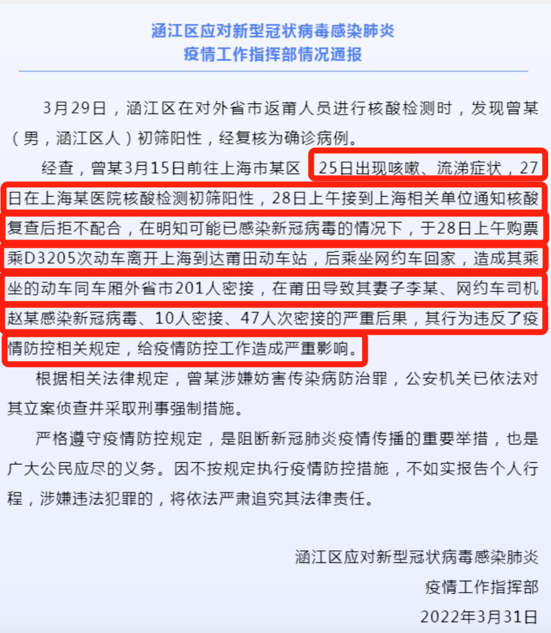 所有人的努力和坚守,都因为一个人的一己之私,毁了!要知道边境城市为了防疫付出了多少,多少人困居家中,多少人丢了生计!更令人不安的是,这样的案例,在这轮疫情中屡见不鲜。疫情当前,本该众志成城,齐心协力,却总有人违反疫情防控规定“顶风作案”。一名男子在上海初筛阳性,出现了流鼻涕、咳嗽等症状,但他逃避复查,乘动车逃回老家。最终导致200多人密接,自己妻子和网约车司机被感染。温某某在3月31日从上海飞往成都,4月1日核酸检测为阳性。不过短短两天时间,温某某凭一己之力感染了20多人,更可气的是,他竟然没有注射过新冠疫苗。