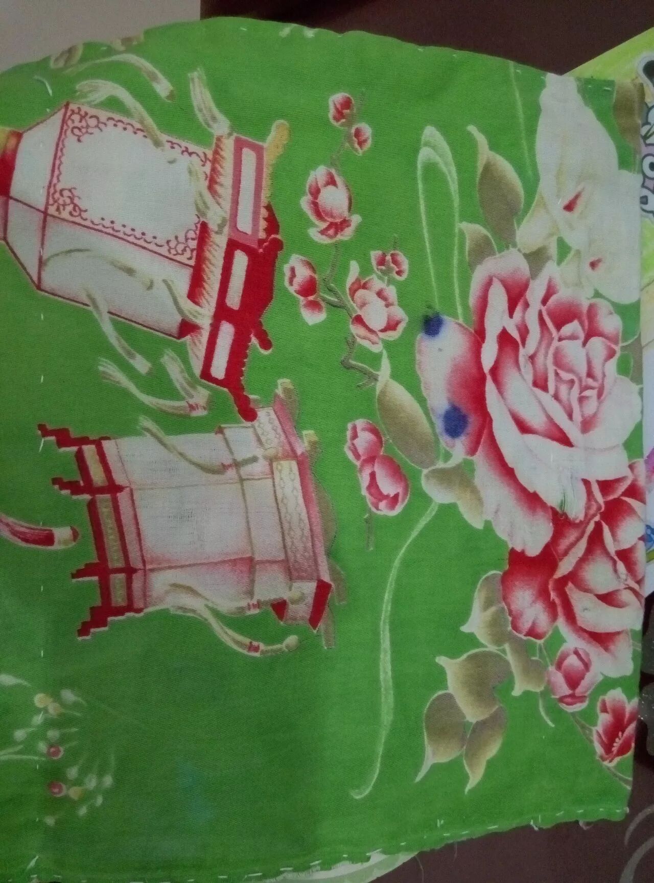 母亲又拿出一片方方正正的尿布,看得出四周都是用大针脚缝过的,布料底子为绿色,上面印制着极具动态的一盏盏宫灯,火烛映照着红彤彤的灯笼,一绺流苏缀在底部,迎着流动的风摆起一根根须子。宫灯旁边则是一朵朵开的正艳的牡丹,粉底红边的花瓣让整个画面显得楚楚动人,不由得我想起了“国色天香”这个最贴切的词语。